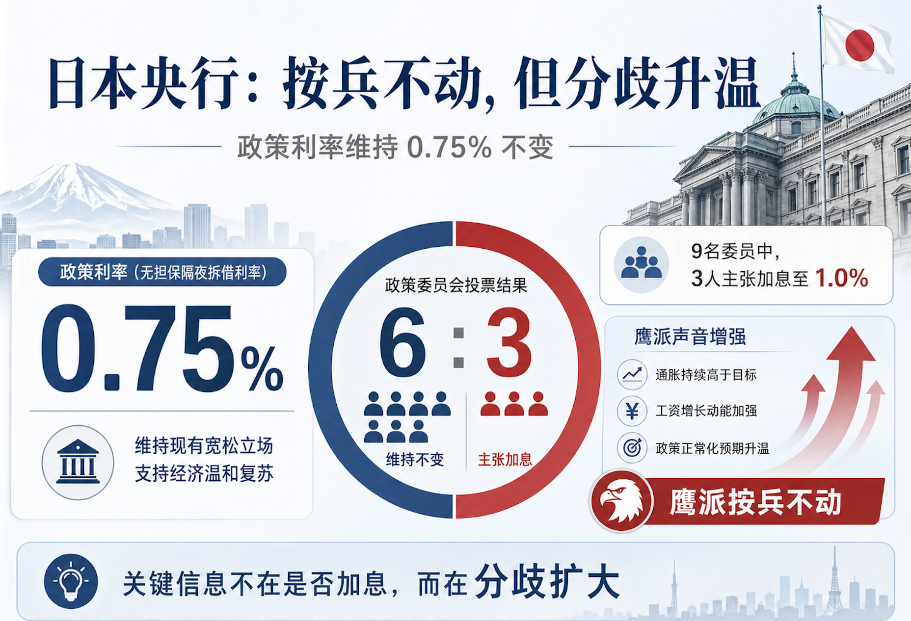 今天全球宏观市场最重要的信号,来自日本央行。表面上看,日本央行只是按兵不动,将短期政策利率维持在0.75%不变;但真正值得关注的,是这次投票结果已经变成6比3,9名委员中有3人主张直接加息至1.0%。这意味着,日本央行给出的并不是一个简单的宽松信号,而是一个“鹰派按兵不动”:政策利率没有上调,但内部对通胀压力的容忍度已经明显下降。