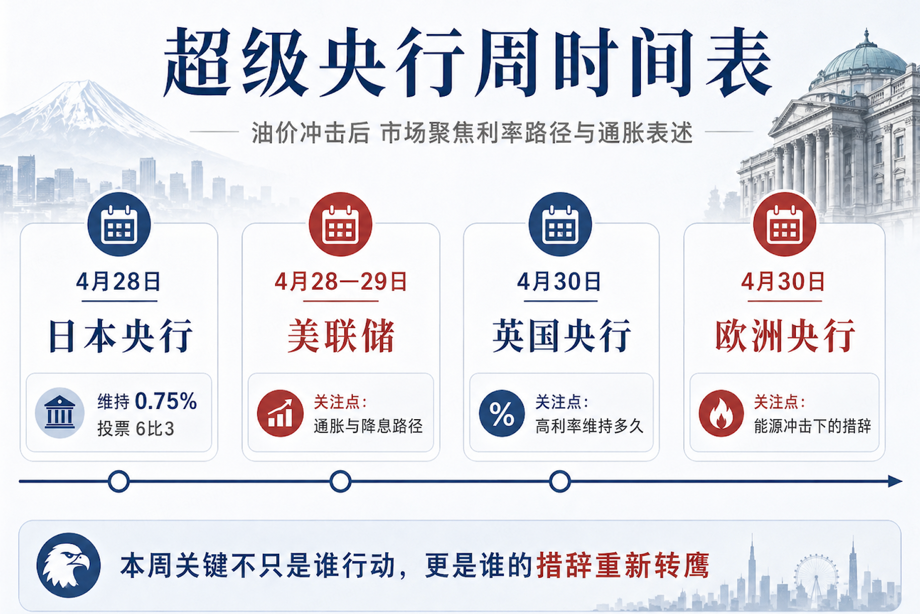 日本央行只是本周第一个出场的主要央行。接下来,美联储将在4月28日至29日召开FOMC会议;英国央行和欧洲央行也都将在4月30日公布利率决定。本周市场真正要看的,可能不是这些央行会不会立刻行动,而是它们会如何描述通胀、能源价格和增长风险。过去一段时间,市场反复交易“什么时候降息”;但在油价上行和通胀预期重新抬头的环境下,利率交易的重点可能正在转向另一个问题:央行会不会比市场想象得更难转鸽,甚至重新保留更鹰派的政策选项。