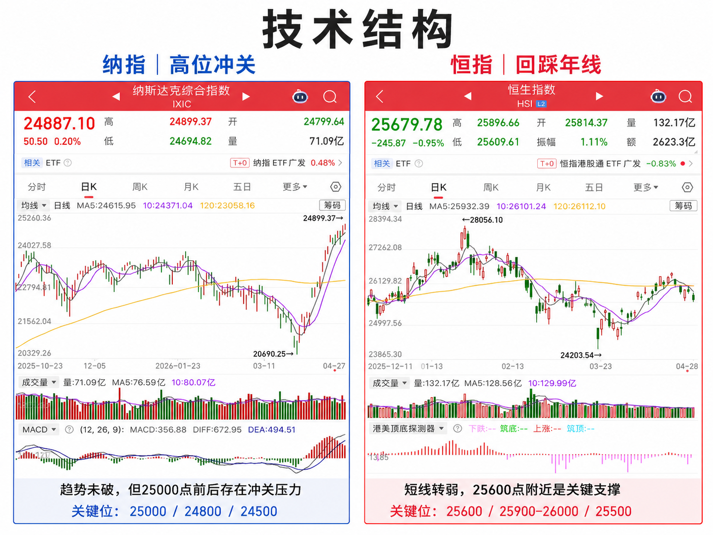 4月末,纳指和恒指走到了两个完全不同的位置。纳指4月27日收于24887.10点,再创收盘新高,距离25000点整数关口只差一步;恒指4月28日收于25679.78点,跌0.95%,已经回到200日均线附近。一个是在连续上涨之后挑战高位关口,一个是在反弹降温后测试年线支撑。当前最重要的变化是,纳指不是简单看“突破后能否站稳”,而是先要看25000点这次闯关能否成功;恒指也不是简单看“跌了多少”,而是看25600点附近的年线支撑能否守住。