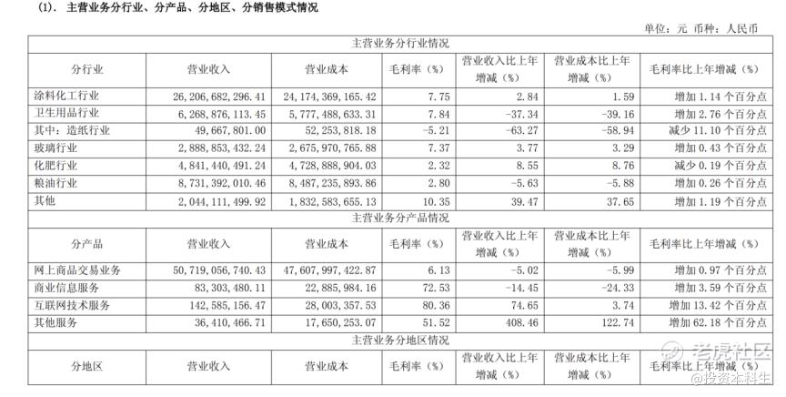 板块上看,基本盘还是涂料化工,收入262.07亿元,占比超过一半;粮油87.31亿元、卫生用品62.69亿元、化肥48.41亿元。