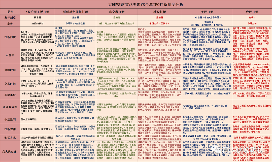 (如下图)小编特地整理汇总了A股(含科创板和北交所)、港股、美股、台股的打新机制和特点,通过不同市场的IPO制度可以让我们快速了解彼此间的差异以及优缺点,可以使我们对全球主流的IPO市场有个宏观的概况和理解,通过对比我们可以清楚的定位自己的需求,以便在参与的过程中可以做到游刃有余。