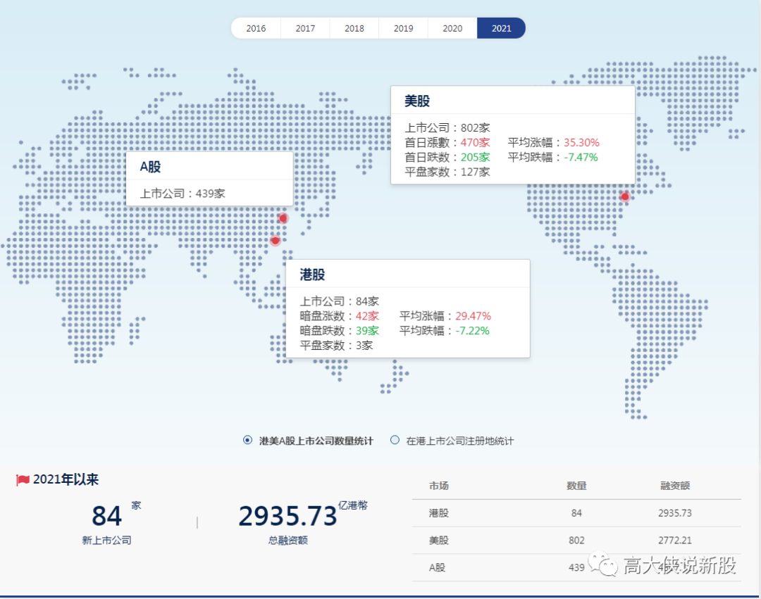 从目前全球IPO市场募资来看,美国牢牢占据着第一位,目前是上市企业802家(含SPAC),总募资额2772.21亿美金,A股上市企业439家,总募资额4507.32元人民币,港股上市企业84家,总募资额2935.73港币。其中美股IPO增速较快,同比去年上市企业数量增长近一倍,募资增长120%,A股在数量和募资额上没有太大区别,轻微增长,港股市场出现较大下滑,上市数量下降60%,总募资额下降20%,变化非常明显。