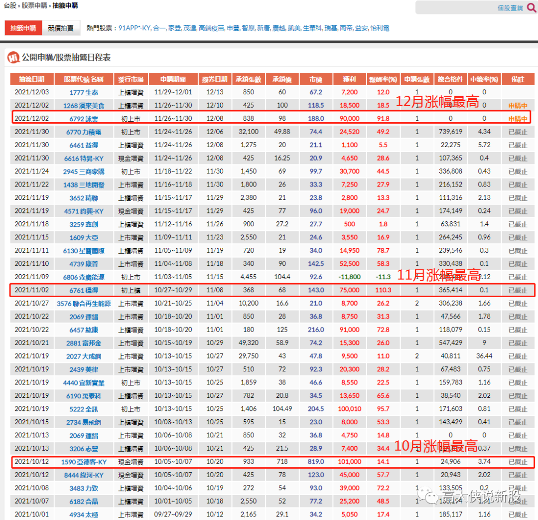 上图是最新的台股IPO公开申购日程表,小编截屏了整个10~11月份的新股数据,从图中可以看到,除了11月9号的森威能源(6806:TW)破发之外,10~11月其余新股全是上涨,并且涨幅惊人,小编分别列举了每个月的涨幅王,10月份竟然有2支票是盈利10万元,令人惊讶,11月最高盈利7.5万元,就连12月份的也提前通告了,最高的盈利9万元,令人咂舌。