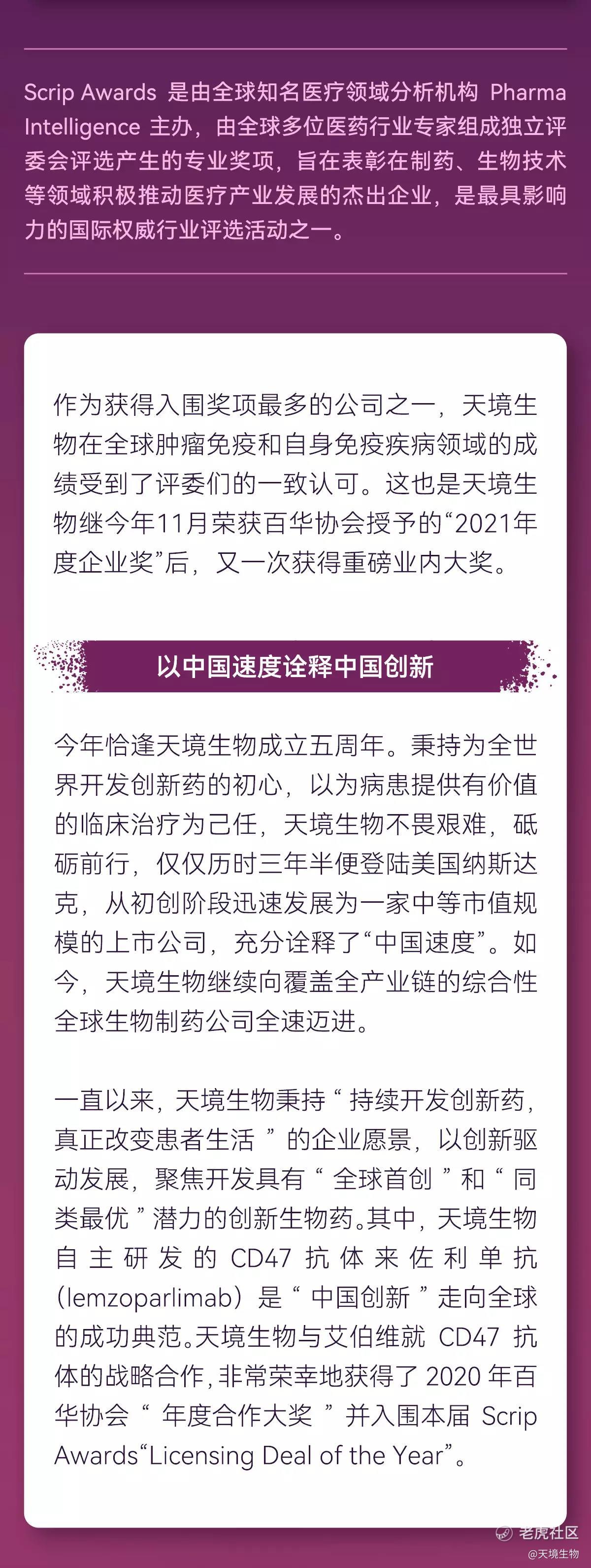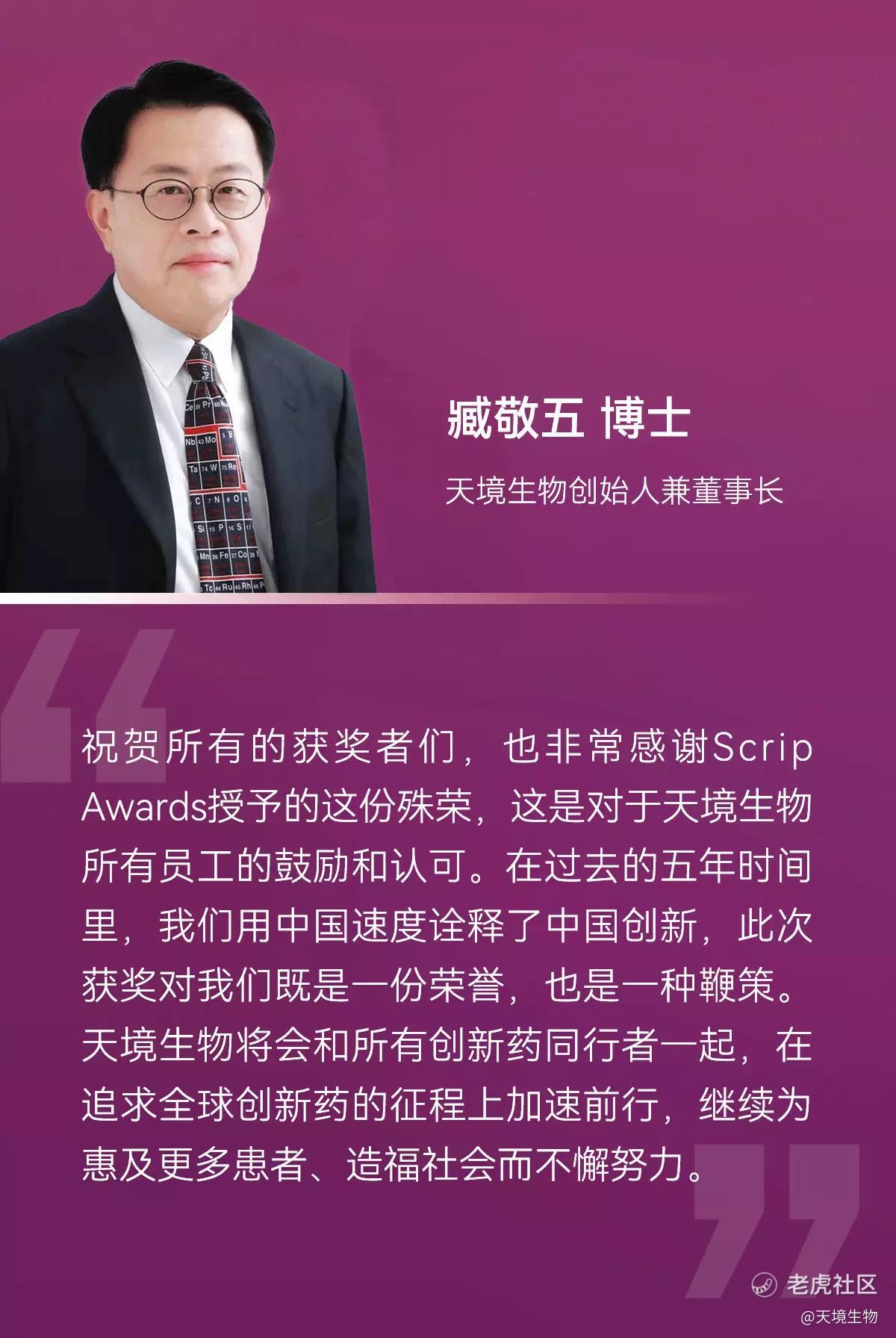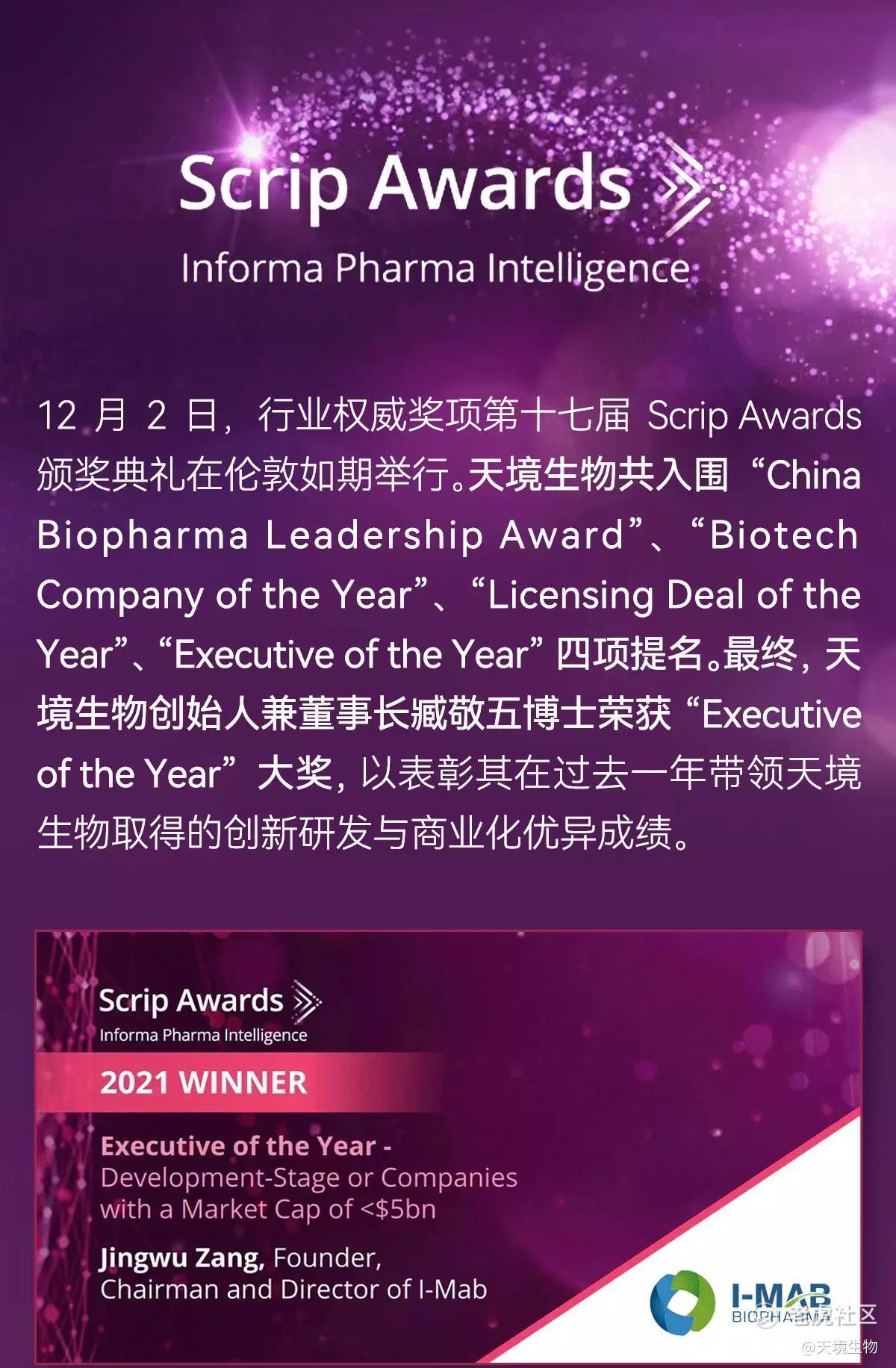 4项重磅提名 1项大奖|天境生物喜获Scrip Awards "Executive of the Year" 殊荣