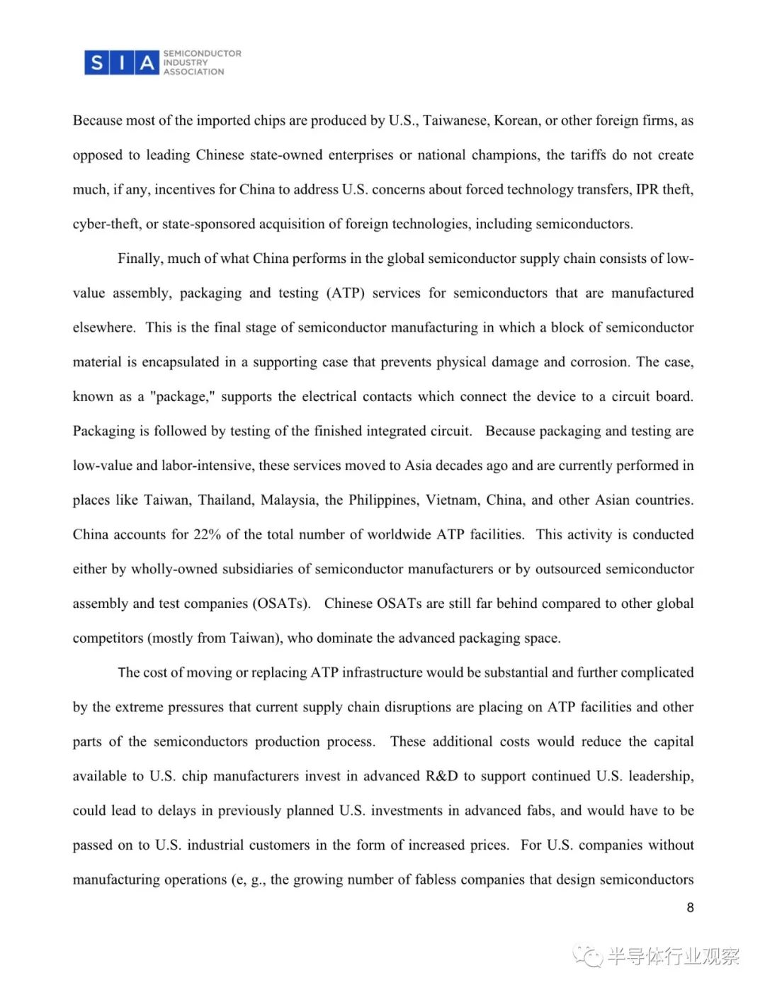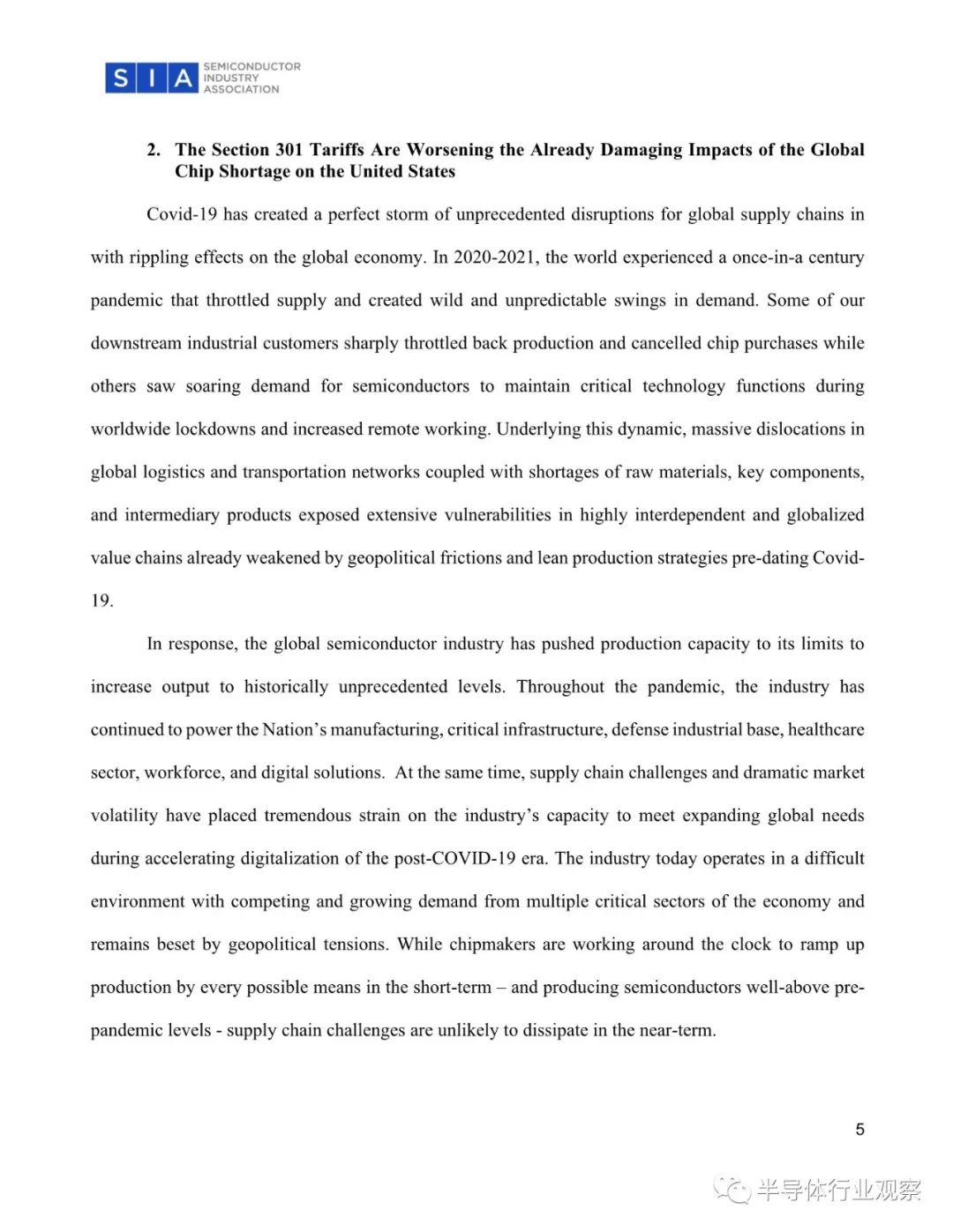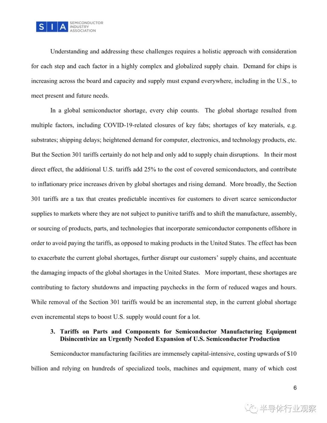 SIA指出,虽然我们国家在与中国的贸易中面临真实而重大的挑战,但SIA仍然坚信对半导体和相关产品征收关税实际上是对美国芯片制造商和消费者的破坏性税收,给我们的经济带来了不必要的负担。此外,关税削弱了半导体行业继续提高产能以满足不断飙升的半导体需求的努力。我们相信,政府可以通过外科手术式的方式取消对半导体和相关产品的关税,而不会限制其继续与中国谈判更有利的贸易和经济条款的影响力。