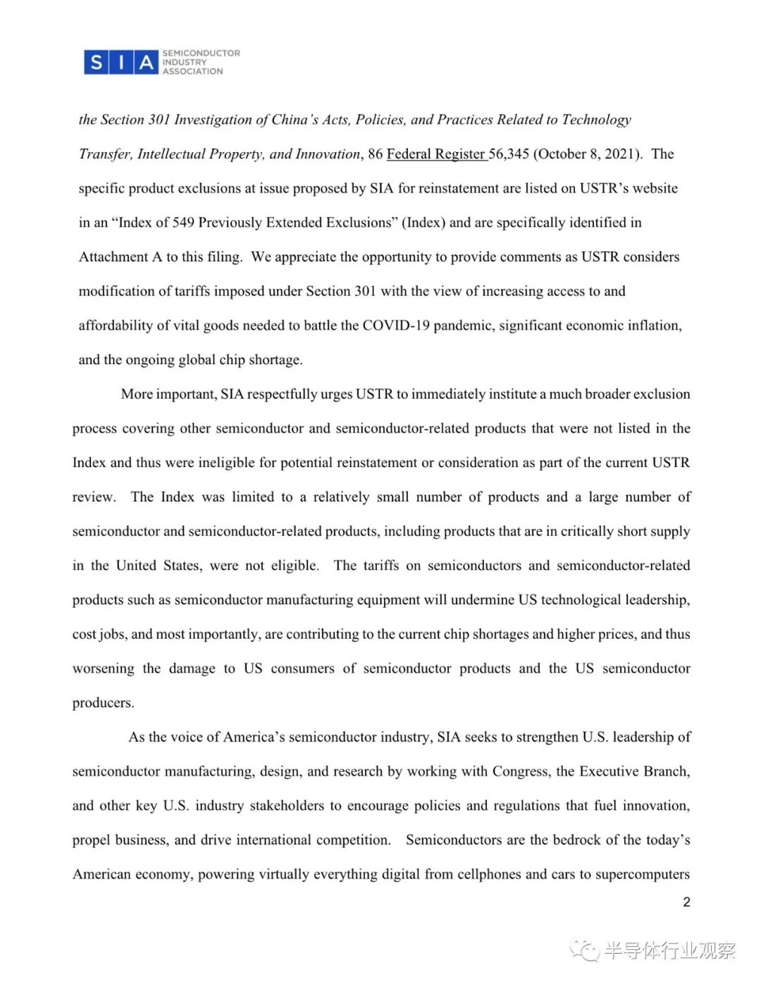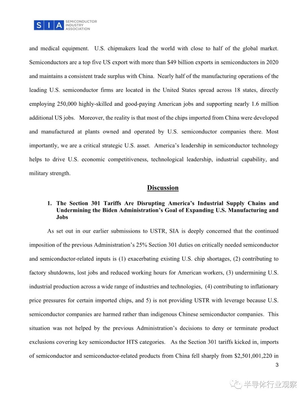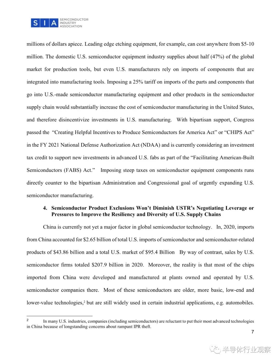 SIA指出,虽然我们国家在与中国的贸易中面临真实而重大的挑战,但SIA仍然坚信对半导体和相关产品征收关税实际上是对美国芯片制造商和消费者的破坏性税收,给我们的经济带来了不必要的负担。此外,关税削弱了半导体行业继续提高产能以满足不断飙升的半导体需求的努力。我们相信,政府可以通过外科手术式的方式取消对半导体和相关产品的关税,而不会限制其继续与中国谈判更有利的贸易和经济条款的影响力。