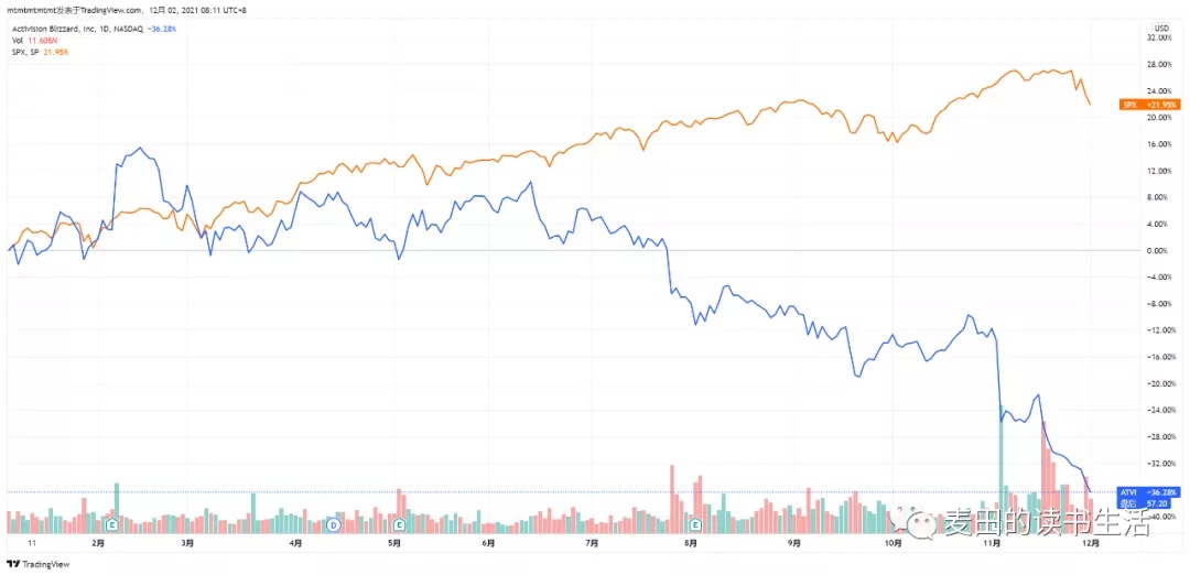 暴雪公司$((ATVI))$今年应该叫“暴跌”!从2月份高点104.53元,一路下跌了十多个月,特别是在11月2号第三季度财报后暴跌,到昨晚跌出了52周新低57.19美元——今年以来,美股大盘涨了22%,暴雪反而跌了36%!如下图。