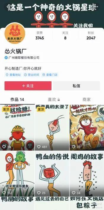 怂的社交账号进一步强化了品牌动漫IP的存在感,抖音和快手账号的内容均为动画剧集,制作成本显然高于店员客串的情景剧。在抖音上,也以怂的IP制作内容,以更年轻化的方式去讲述火锅相关的故事。