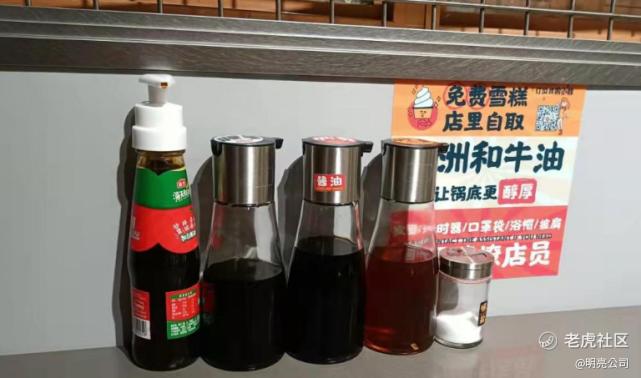 茶水只有一款,为酸梅茶茶包,同时也有自助冰淇淋,纸巾也是免费。调料上除了配的爱心蒜泥碗,还有蚝油、生抽、香油、陈醋和盐,没有像其他火锅店那样有非常多的配置调料,这些调料不收费。这种设置也是为了最大程度减少用户选择时间,同时也减少了对外采购成本。