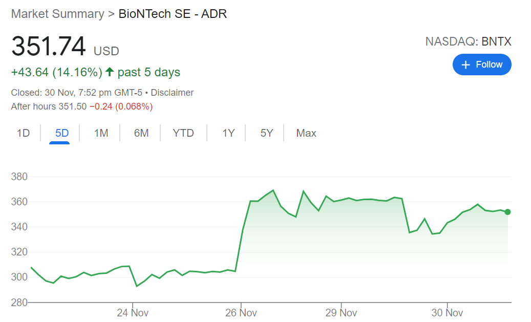 BioNTech‘s American depositary receipt jumped 14.2% Friday but back to 351 on Tuesday.