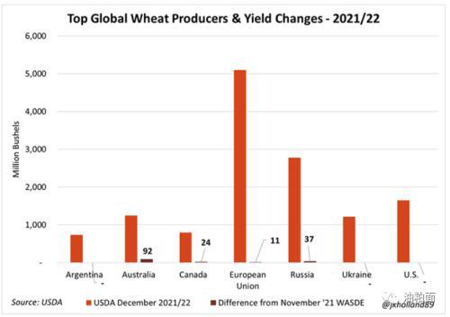 正如Holland指出的那样,尽管存在早期干旱问题,美国农业部仍保持2021/22年阿根廷小麦产量不变。但最近几周的阵雨有助于减少一些生产担忧。澳大利亚经历了干旱的一周,收获持续,质量担忧得以缓解。美国农业部将澳大利亚的产量提高了近9200万蒲式耳,因此在2021/22年的营销活动中,产量达到11.6亿蒲式耳。