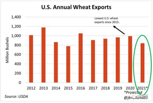 有趣的是,2021年10月美国农业部外国农业服务(FAS)和美国统计局的数据显示,小麦的每月发货量比一年前下降了30%。每周FAS发布的出口货物数据显示,2021年11月的小麦产量比2020年11月的同类发货量低了近1000万蒲式耳(19%)。