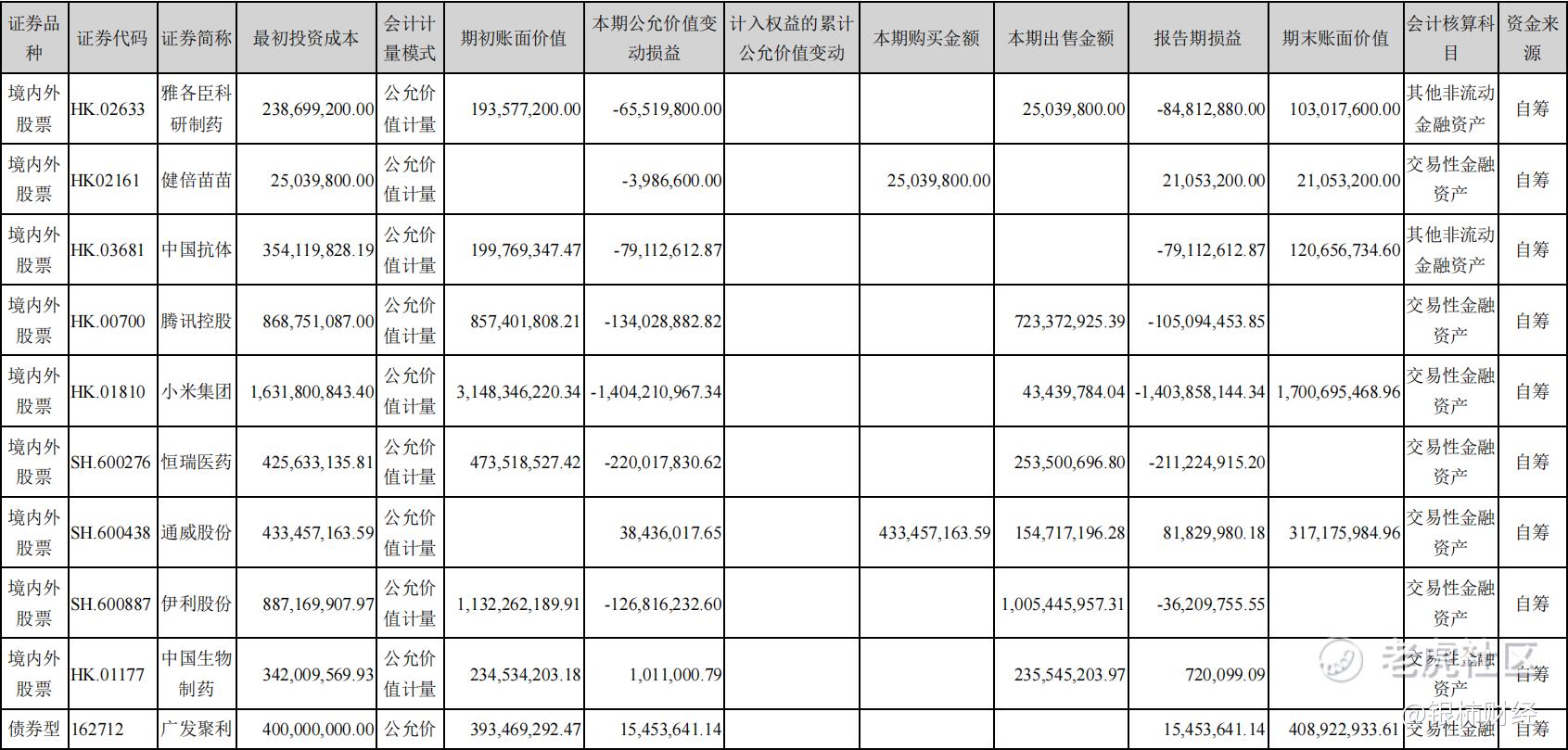 可以看出,云南白药2021年净利润接近腰斩,原因即为公司购买的多只股票价格下跌。利润表显示,云南白药2021年实现公允价值变动损失19.29亿元,而2020年为实现22.4亿元的收益。从云南白药披露的最新数据看,公司已经清仓了腾讯控股(00700.HK)、恒瑞医药(600276.SH)等多只股票。