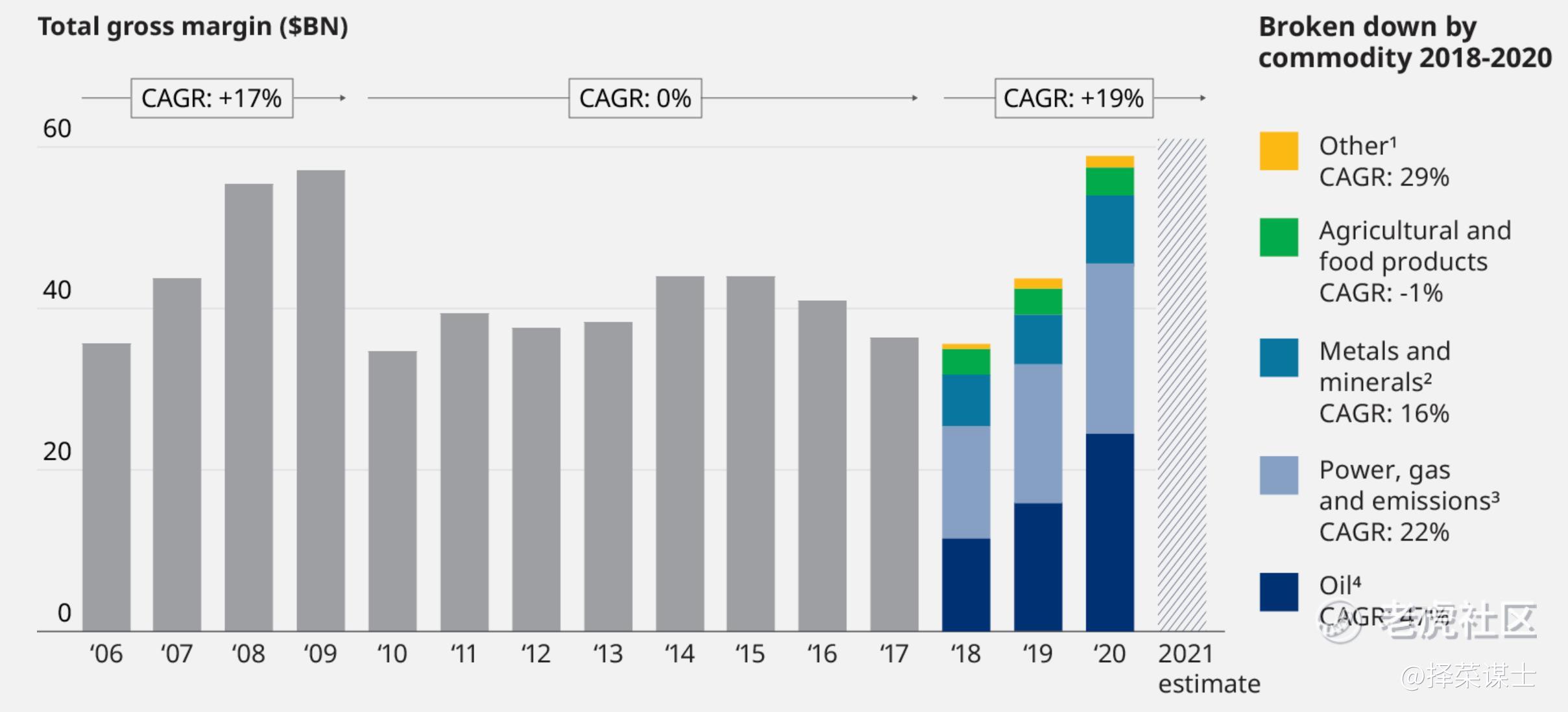 1. 2021年大宗总贸易的毛利率达到创纪录的水平,如此高水平的毛利持续太长时间很难:自 2020 年以来,全球经济面临过去 50 年来最艰难的两年——大流行、干旱、野火、内乱,以及现在的欧洲战争,尽管大流行、地缘政治紧张局势加剧以及能源转型即将发生根本性变化,导致市场中断和巨大的不确定性,但大宗商品的总贸易毛利率仍达到创纪录水平,已经超过06-08年大宗商品的超级牛市,根据威达信的报告,2020 年的毛交易利润率略低于 600 亿美元,初步估计为2021 年的毛利率水平高于此水平,2022年可能更高。