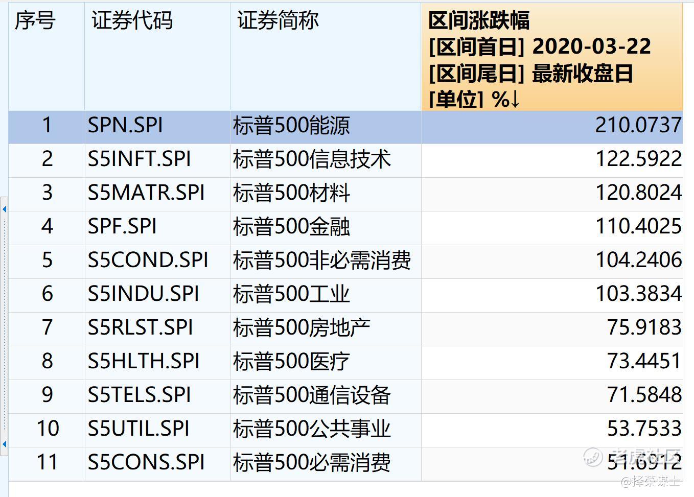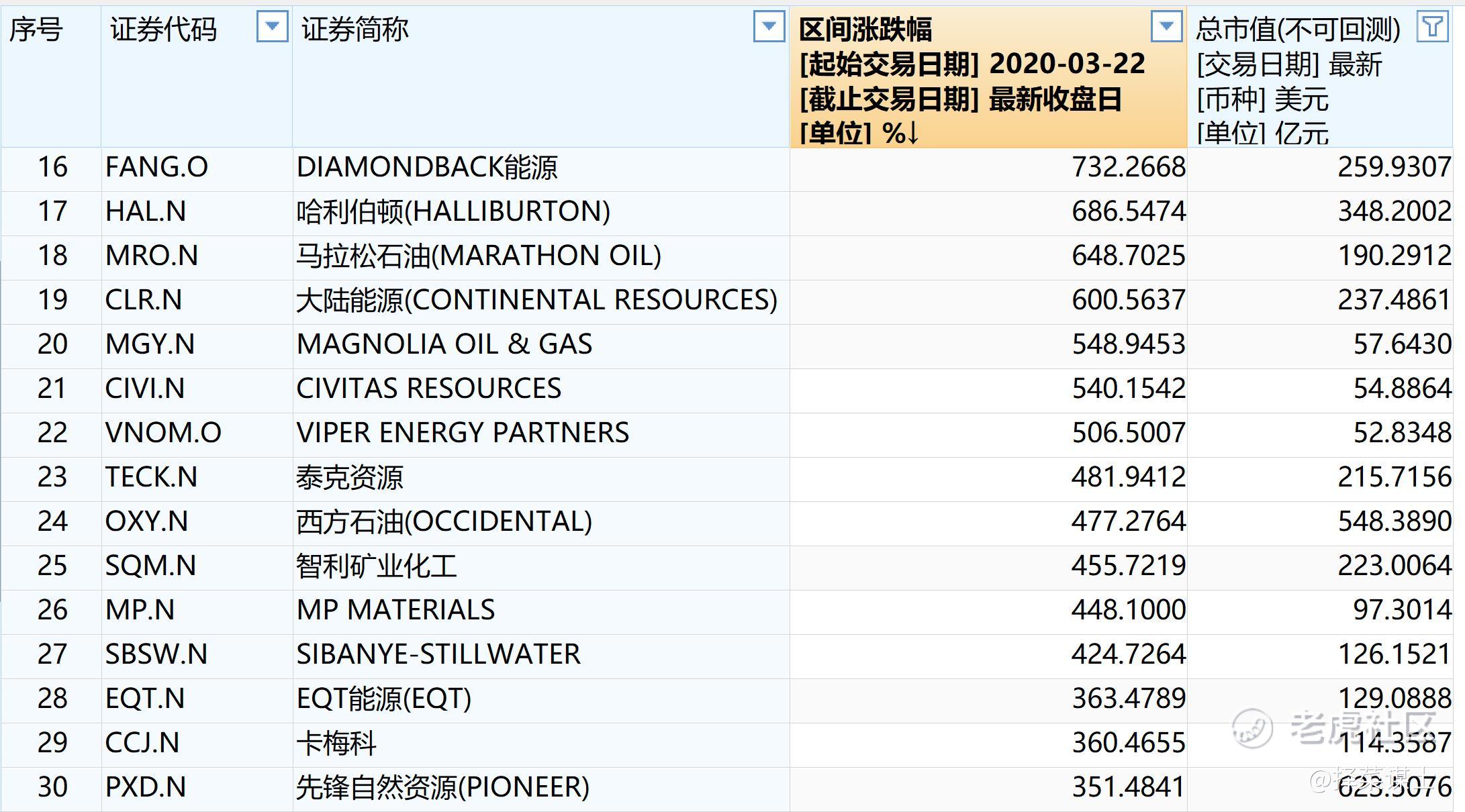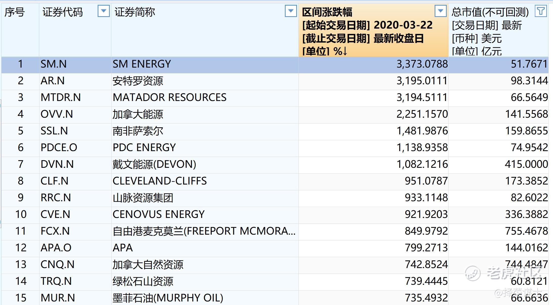从标普的行业涨幅来看,从熔断至今,标普500能源指数的涨幅已经远超过疫情受益的信心技术概念,以210%的涨幅遥遥领先,涨幅超过十倍,市值50亿美元以上的公司非常多。