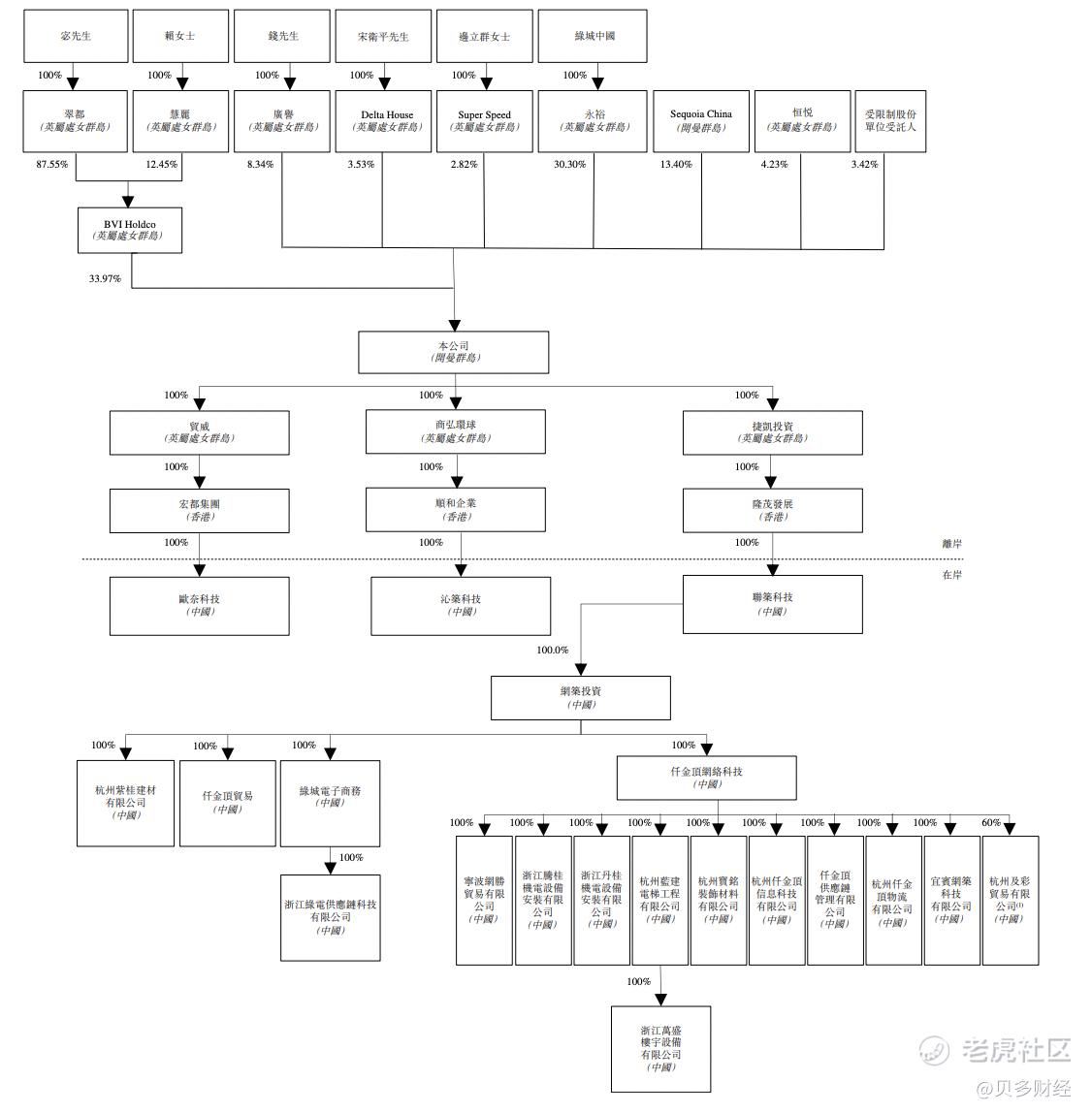 其中,二人在BVI Holdco中分别持有87.55%、12.45%的权益。在网筑集团重组后、本次上市前的股权架构中,宓建栋、赖伟央合计持股33.97%,绿城中国通过永裕持股30.30%,红杉资本旗下红杉中国Sequoia China持股13.40%。