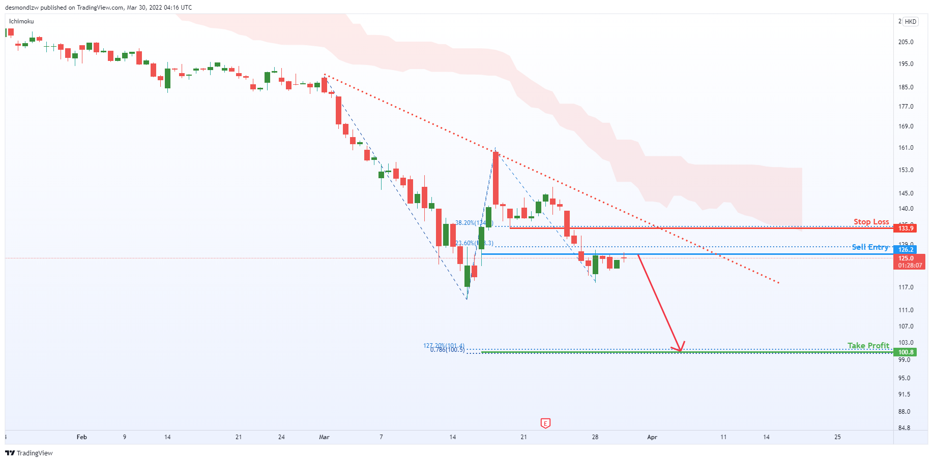 Hey guys! Anyone eyeing on Prices abiding by a descending trendline and are on bearish momentum. We see the potential for dip from our sell entry at 126.2 which is a graphical overlap. Probably going to short to our Take Profit at 100.8 in line with 61.8% Fibonacci retracement. I'll have my stop loss potentially at 133.90in line with 61.8% Fibonacci projection. Prices are trading below the ichimoku clouds, further supporting our bearish bias.