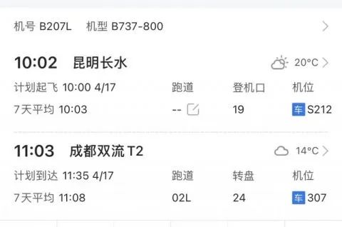 4月17日,飞常准APP显示,一架东航波音737-800飞机往返于昆明至成都航线。