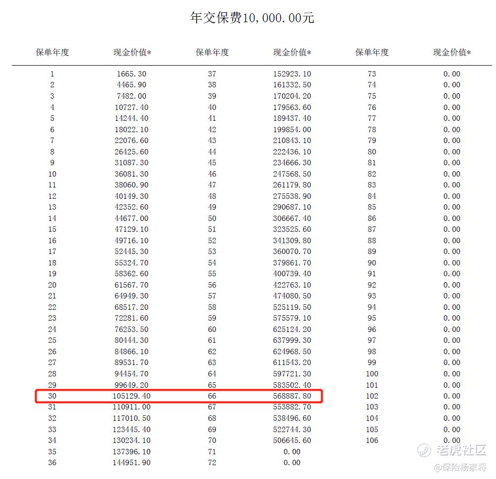 2)在保单第30年时(红色方框),退保可以拿回105129.4元。