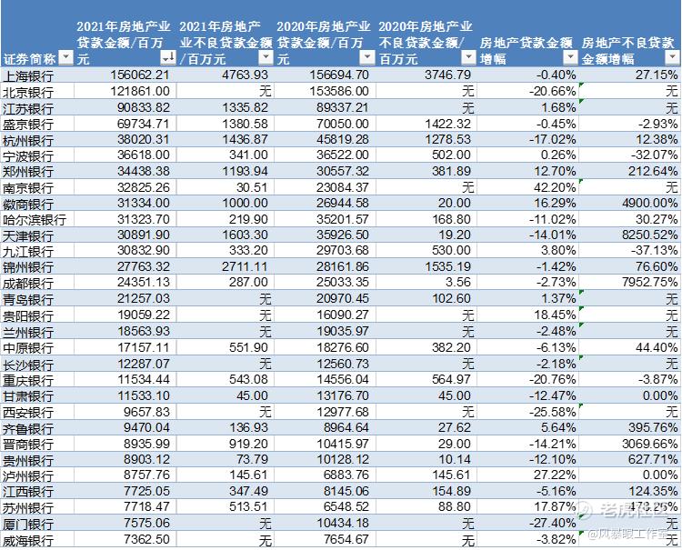 截至2021年末,30家上市城商行房地产贷款金额合计9443.88亿元,同比下降3.97%。