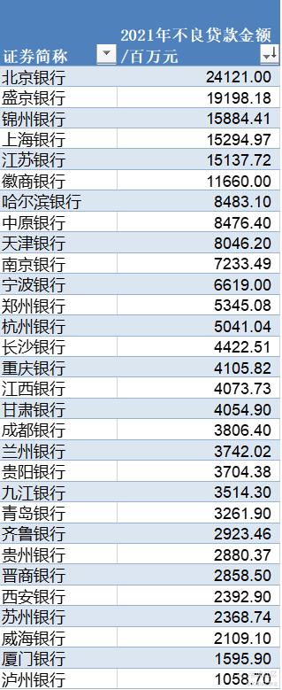 30家上市城商行中不良贷款金额排名前三的分别是北京银行、盛京银行、锦州银行,其中北京银行不良贷款金额为241.21亿元,占30家城商行合计不良贷款总额的11.86%。