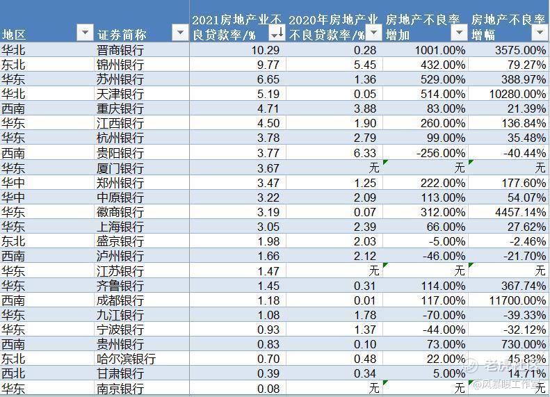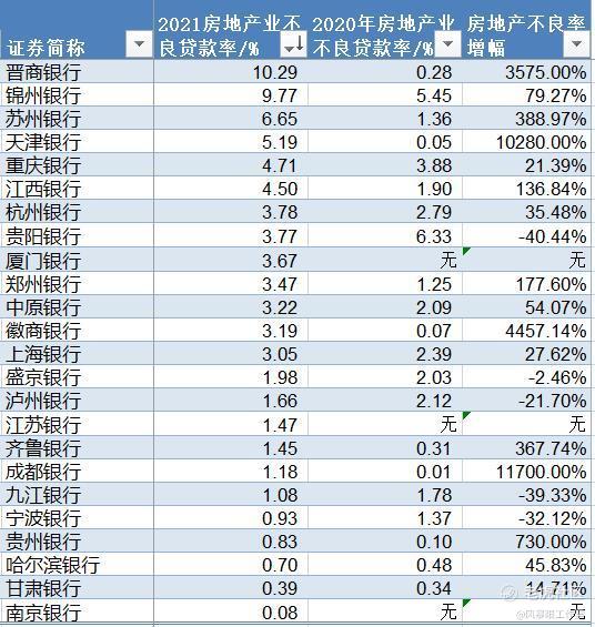 房地产不良贷款率增幅方面,排在前三名的分别是成都银行、天津银行、徽商银行,增幅分别为117倍、102倍、44倍。