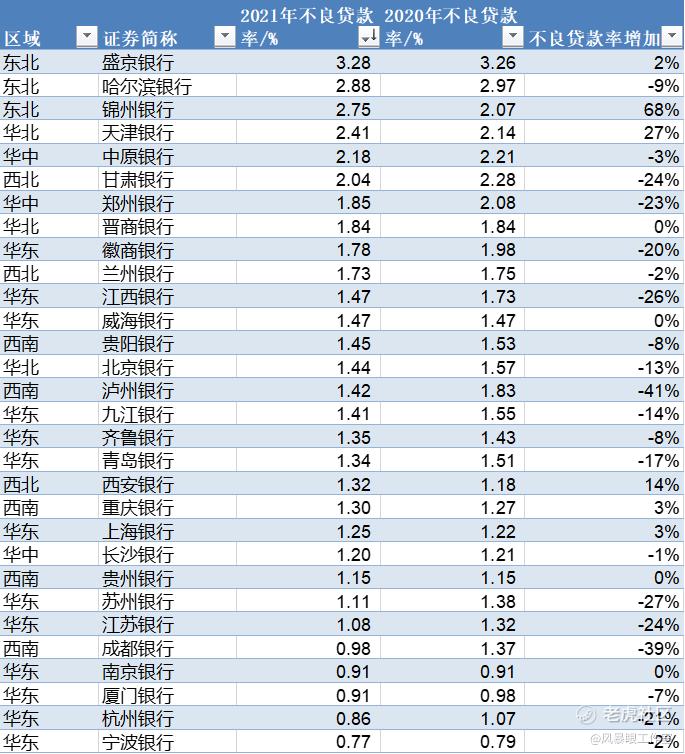 对比来看,华东地区的城商行不良贷款率表现明显好于东北地区,全国30家城商行中2021年不良贷款率最低的7家银行中有6家来自华东地区,其中宁波银行、杭州银行、厦门银行、南京银行分别以0.77%、0.86%、0.91%、0.91%的不良率排在前四位。