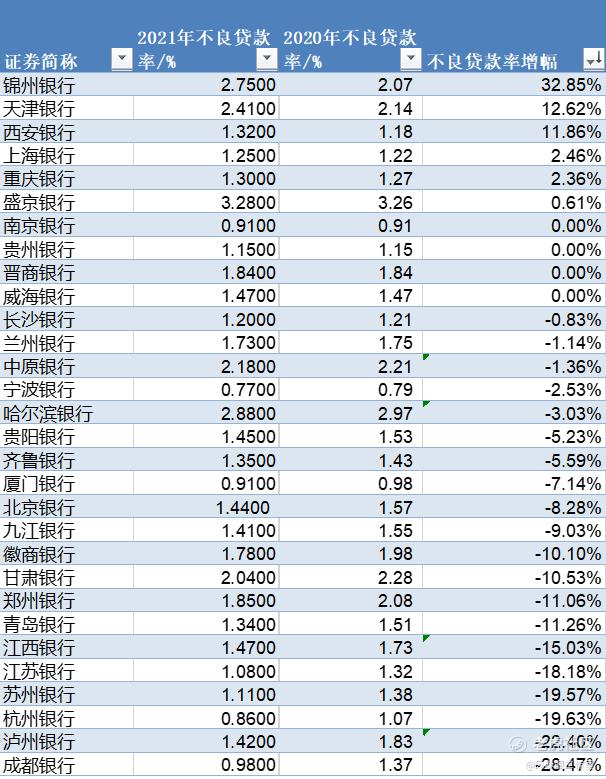 30家上市城商行中有20家银行不良贷款率同比下降,有4家与2020年末持平,有6家同比上升。从统计数据来看,不良贷款率增幅最高的前三名分别是锦州银行、天津银行、西安银行,锦州银行不良贷款率增幅达32.85%。不良贷款率降幅最大的三家银行分别是成都银行、泸州银行、杭州银行,成都银行不良贷款率降幅达28.47%。