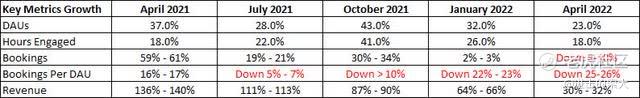 不幸的是,Roblox 的问题似乎不会很快消失。对于第二季度,华尔街正在寻找实际再次增长近 2% 的预订量,但我不确定现在是否有可能。原因如下表所示,显示了每个财政季度第一个月的关键指标增长,可追溯到去年第二季度。
