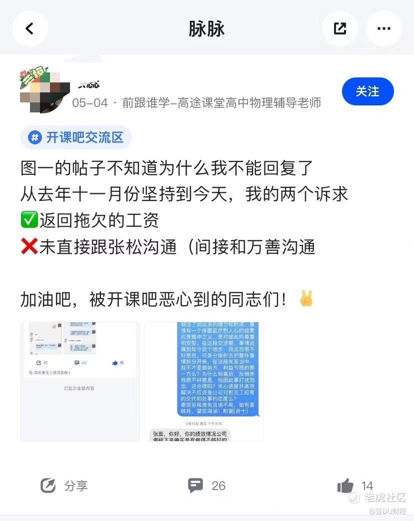 在脉脉的交流区,从3月开始,就有用户曝出“开课吧拖欠工资”的信息。其诉求只是“要回拖欠工资”。