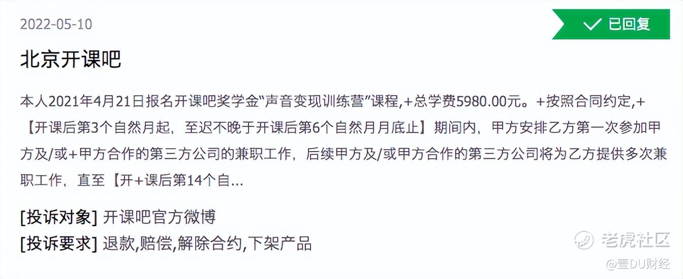 一位投诉者称自己在4月21日报名开课吧奖学金“声音变现训练营”课程,按照合同,开课后第3个自然月起,至迟不晚于开课后第6个自然月月底止,甲方安排兼职工作,如未做到,将返还相应学费。但目前来看,当时班级内一百多名学员无一赚取足够报酬,并且老师对于退费问题避口不谈。