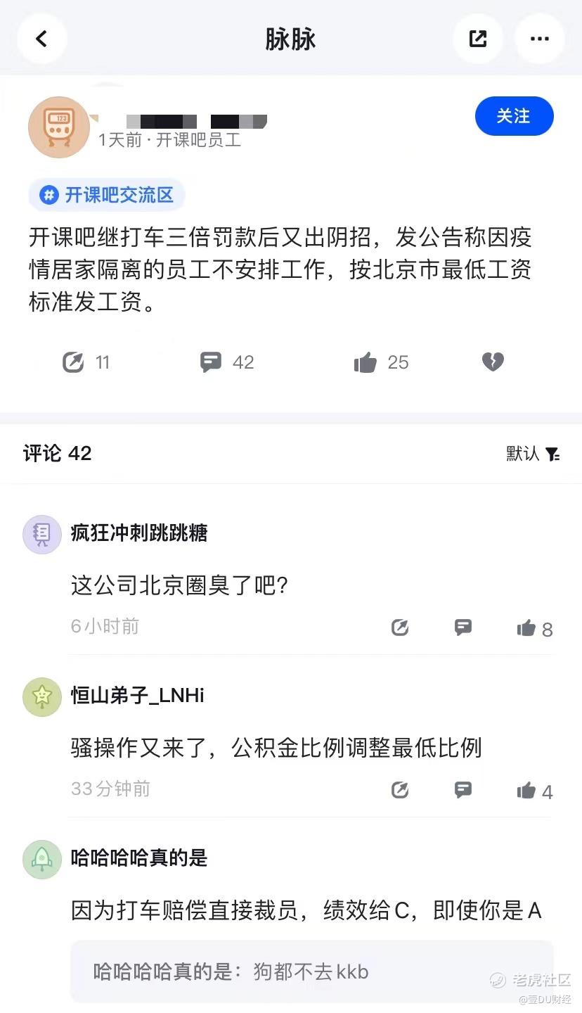 5月9日,一位认证为“开课吧员工”的用户曝出:“开课吧继打车三倍罚款后又出阴招,发公告称疫情居家隔离的员工不安排工作,按北京市最低工资标准发工资”的信息。