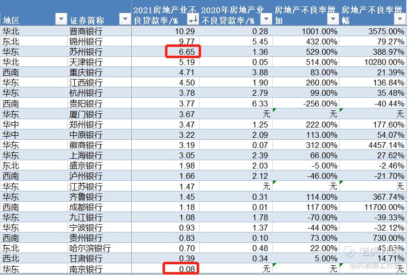 1、2021年末,苏州银行房地产不良贷款率高达6.65%,而同为华东地区城商行的南京银行房地产不良贷款率仅为0.08%,苏州银行是南京银行的83倍。