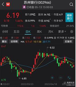 至今,苏州银行同样处于破发状态,截至2022年5月13日,苏州银行收盘价为6.19元,按照后复权价格,较发行价跌幅4.8%;市净率0.7,处于破净状态。