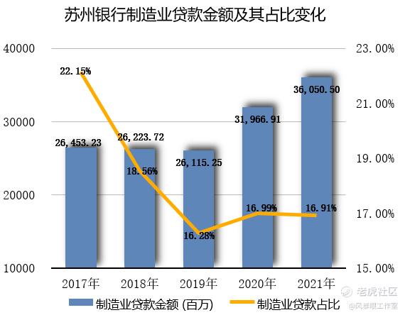 2、在服务实体经济方面,苏州银行表现并不像其宣称的那么好。截至2021年末,苏州银行制造业贷款占比为16.91%,较2017年的22.15%下降了5.24个百分点,降幅达23.66%。