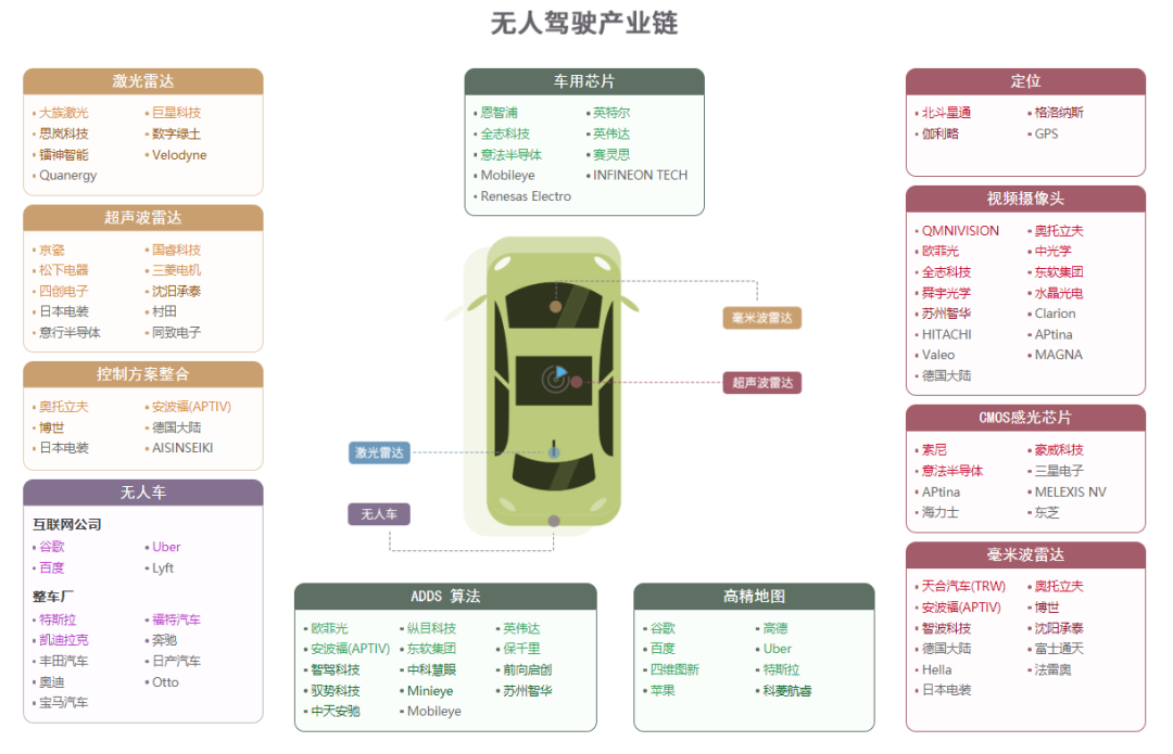 图 1是无人驾驶行业的产业链,从图中可以看到,无人驾驶系统包括多种雷达系统、定位系统、控制芯片、控制算法、地图导航、系统整合以及整车厂商数十个零部件供应商,一旦有一个环节遭遇瓶颈,整个产业都可能陷入无法正常生产的困局。