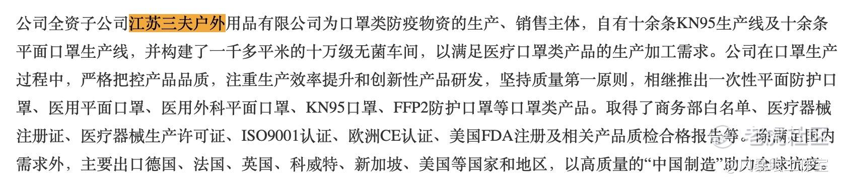 2020年年报显示,三夫户外全资子公司江苏三夫户外用品有限公司为口罩类防疫物资的生产、销售主体。从数据来看,三夫户外的口罩生意从一开始就在亏损,2020年亏损1854万元,也并没能延续太久,2021年,江苏三夫营业收入收缩,亏损也下降至527万元。