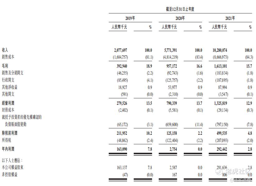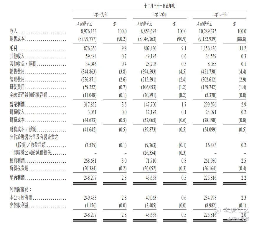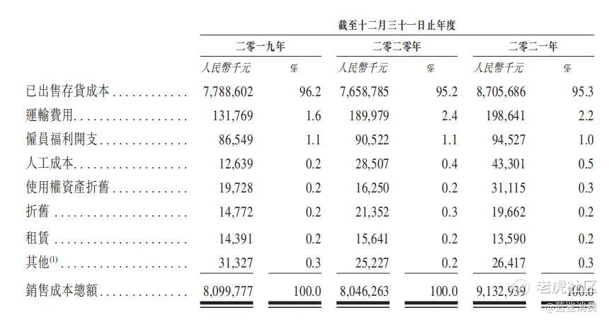 低毛利率一直是百果园发展难以逾越的屏障。招股书显示,2019-2021年,百果园的毛利分别为8.76亿元、8.07亿元与11.56亿元,毛利率分别为9.8%、9.1%及11.2%。同期净利润分别为2.49亿元、0.49亿元与2.35亿元,净利润率分别为2.8%、0.5%及2.2%。业内人士认为,百果园做的还是流通生意,这是链条中利润率最低的部分。招股书显示,2019-2021年,百果园的销售总成本分别高达81.00亿元、80.46亿元和91.33亿元,占总营收的90.2%、90.9%和88.8%。其中,已出售存货成本分别占销售成本的96.2%、95.2%及95.3%,已出售存货成本(主要为采购成本)居高不下制约了其毛利率的提升。