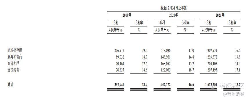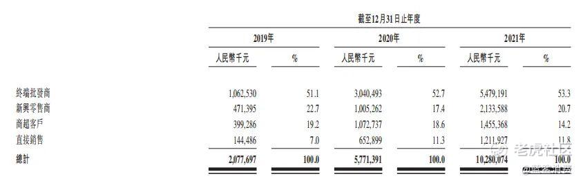 与百果园直接面向消费者不同,洪九果品的渠道主要有四种,即终端批发商、新兴零售商、商超客户、直接销售。其中,终端批发商一直是洪九果品的最大渠道,2019-2021年,终端批发商的销售占比分别为51.1%、52.7%、53.3%,而得益于近年来社区团购和即时电商的兴起,新兴零售商对洪九果品的收入贡献越来越大,2019-2021年,新兴零售商销售占比分别为22.7%、17.4%、20.7%。