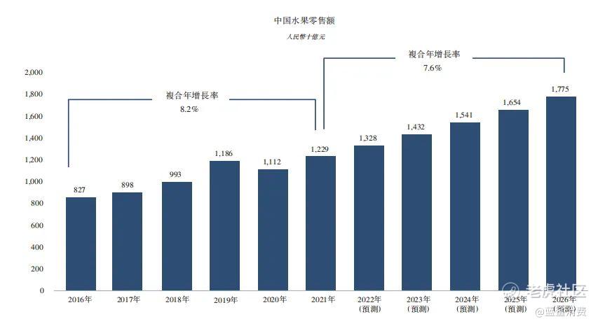 近年来,随着中国人均可支配收入的提高,人们的消费水平和健康意识也不断增强,消费者关注的焦点逐渐从“吃得饱”转向了“吃得好”、“吃得健康”,由此推动了中国水果销量不断攀升。根据弗若斯特沙利文数据,中国水果零售市场规模已由2016年的8273亿元增长至2021年的12290亿元,复合年增长率为8.2%。