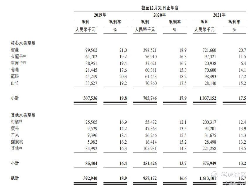 洪九果品获得较高毛利率的关键在于打造品类品牌。招股书显示,洪九果品在14个水果品类中成功打造了18个水果品牌,有效增强了产品的差异化,并带来较高的品牌溢价。洪九果品的品牌水果产品产生的收入占总收入的70%以上,远超行业平均水平。以洪九果品的核心水果榴莲为例,2019-2021年的毛利率分别为21%、18.9%、20.7%。藉此,洪九果品取得了行业领先的毛利率。2019-2021年,洪九果品综合毛利率分别为18.9%、16.6%、15.7%,远高于百果园的9.8%、9.1%、11.2%。