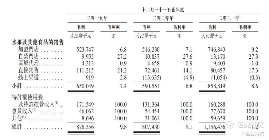 百果园特许经营模式的“聪明之处”在于让利给加盟商。招股书显示,2019年-2021年,百果园直营门店的毛利率分别为27.2%、27.6%、27.3%,来自加盟门店的毛利率为6.8%、7.1%、9.2%,这意味着,加盟门店能够获得接近或者超过20%的毛利率,而百果园自身最高的综合毛利率2021年为11.2%。