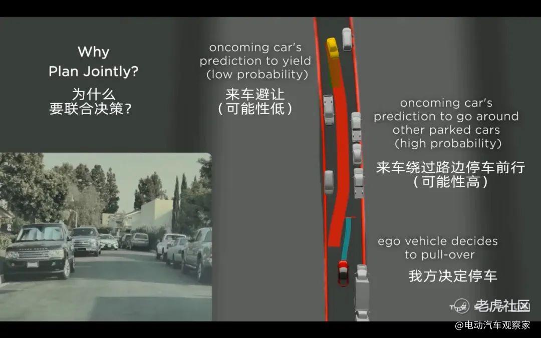 去年的AI DAY上特斯拉展示过一个窄道会车的场景。自动驾驶车辆在开始时认为他车会继续行驶,因此靠右等待,发现他车也停下让行后,立刻前进了。