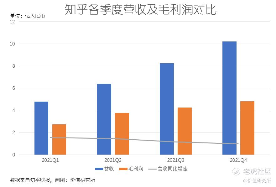 与此同时,知乎的毛利润和毛利率水平也得到持续改善。数据显示,去年四个季度知乎毛利润分别录得2.73、3.77、4.25和4.8亿,全年毛利润高达15.54亿,同比大涨105.1%。