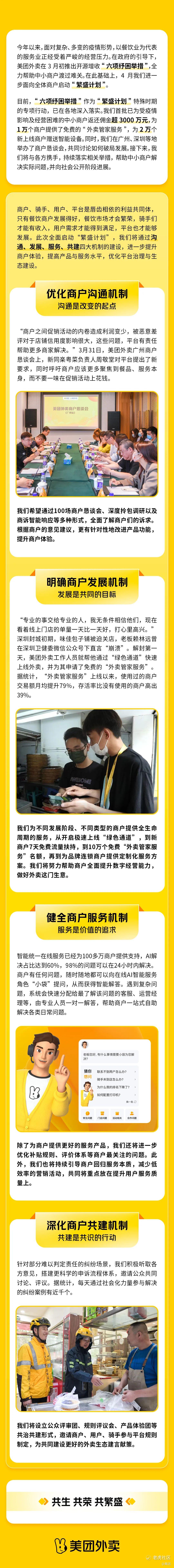 今年以来,面对复杂、多变的疫情形势,以餐饮业为代表的服务业正经受着严峻的经营压力。在政府的引导下,美团外卖在 3 月初推出开源增收 “六项纾困举措”,全力帮助中小商户渡过难关。在此基础上,4 月我们进一步面向全体商户启动“繁盛计划”。