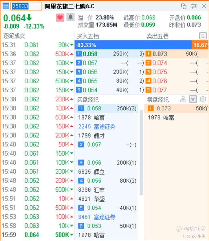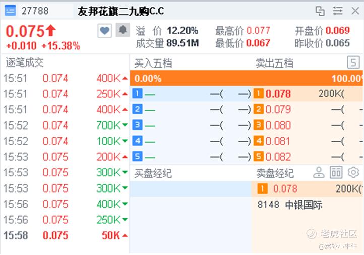 当然,熄机的时候买卖盘不一定都是空的,如下图,买盘有一个200K的挂单,经纪席位是中银国际,但是这个轮的发行商是花旗,所以这个是一个散户的挂单。