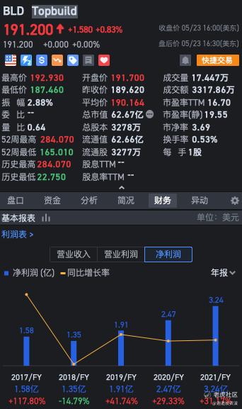Topbuild(BLD)的股价在2021年达到$284的最高点,2022年下滑,目前股价为$191;5年来毛利率从24%提升到了28%,在这个板块非常高;净资产收益率从16%提升到了21.7%,也很吸引人。