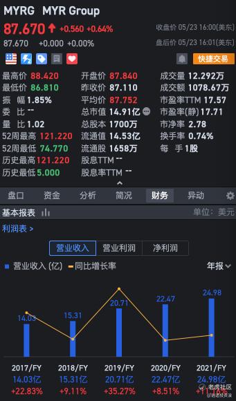 MYR Group(MYRG)股价在2021年达到$121.22最高点后大幅下滑,目前价格为$87.67;5年来毛利率从9%左右提升到了13%左右,净资产收益率也从8%左右提升到了接近18%。