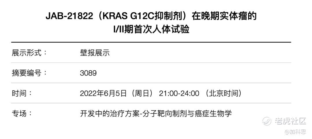 北京、上海和波士顿2022年5月27日 --加科思药业(1167.HK)将于2022年6月3日至6月7日召开的2022年美国临床肿瘤学会(ASCO)年会上以壁报形式公布KRAS G12C抑制剂JAB-21822的临床一期研究数据。研究摘要已于今日在ASCO官网发布。