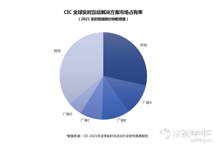 根据独立第三方行业研究与分析机构 CIC 灼识咨询发布的《2021 年全球实时互动云(RTE-PaaS)行业研究报告》(以下简称“报告”)显示,作为实时互动云服务行业开创者和引领者,声网继续蝉联全球实时互动解决方案市场份额第一,根据 2021 年实时互动解决方案支持的实时互动音视频分钟数及年度营收两个指标计算,声网的全球市场占有率均遥遥领先其他服务商。